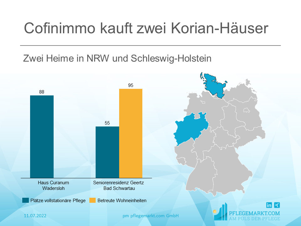 Cofinimmo (Euronext Brüssel: COFB) hat Kaufverträge für den aufschiebend bedingten Erwerb von zwei Pflegeeinrichtungen in Deutschland unterzeichnet. Das erste Objekt befindet sich in Schleswig-Holstein, das zweite in Nordrhein-Westfalen. Die Investitionssumme für beide Objekte beträgt zusammen ca. 23 Mio. EUR, inklusive Grunderwerbsteuer und Bauleistungen. Beide Objekte sind derzeit in Betrieb und werden von der Korian-Gruppe (Rang 1 der Top 30 Pflegeheimbetreiber 2022) betrieben.