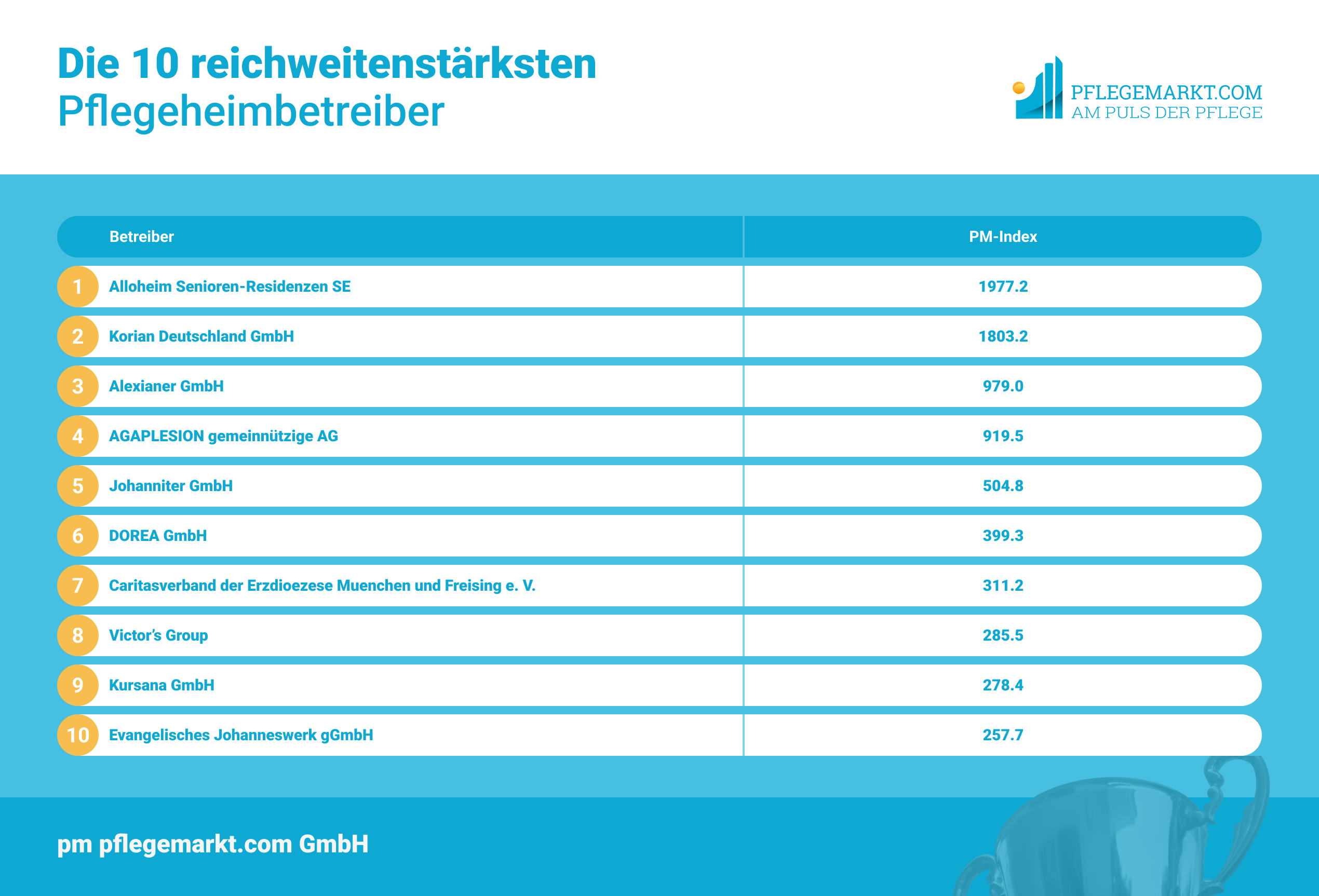 Auf Rang zwei folgt mit einem PM-Index von 1.803,2 die Korian Deutschland GmbH. Mit deutlichem Abstand folgt auf Rang drei die Alexianer GmbH mit einem PM-Index von 979,0. Darauf folgen zwei weitere gemeinnützige Betreiber: Die AGAPLESION gemeinnützige AG und die Johanniter mit einem PM-Index von 919,5 bzw. 504,8.