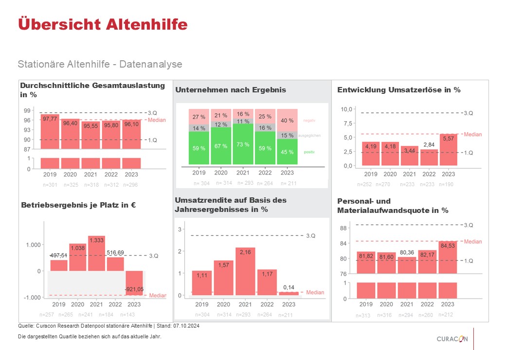 Eine Auswertung wirtschaftlicher Kennzahlen der letzten fünf Jahren aus Jahresabschlüssen ambulanter und stationärer Pflegeeinrichtungen, zeigt eine besorgniserregende Entwicklung. Die Anzahl der Einrichtungen mit positiven Ergebnissen ist deutlich zurückgegangen. In der stationären Pflege sind die Betriebsergebnisse je Platz in 2023 massiv eingebrochen. Ursächlich hierfür sind gestiegene nicht refinanzierte Kosten, die zu höheren Personal- und Materialaufwandsquoten führen. So liegt die Umsatzrendite trotz steigender Nachfrage in 2023 nur noch bei 0,14 %.
