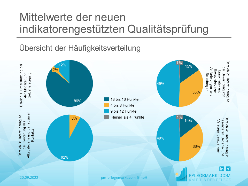 Insgesamt zeigt die aktuelle Auswertung der neuen Indikatorengestützten Qualitätsprüfungen im Bereich der externen Qualitätsprüfung keine großen Schwankungen zwischen verschiedenen Pflegeheim-Arten oder geographischen Unterschieden. Dennoch zeigt sich bereits jetzt, dass – im Gegensatz zu den alten MDK-Benotungen – bei weitem nicht jedes Pflegeheim mit Höchstnoten ausgezeichnet wird.