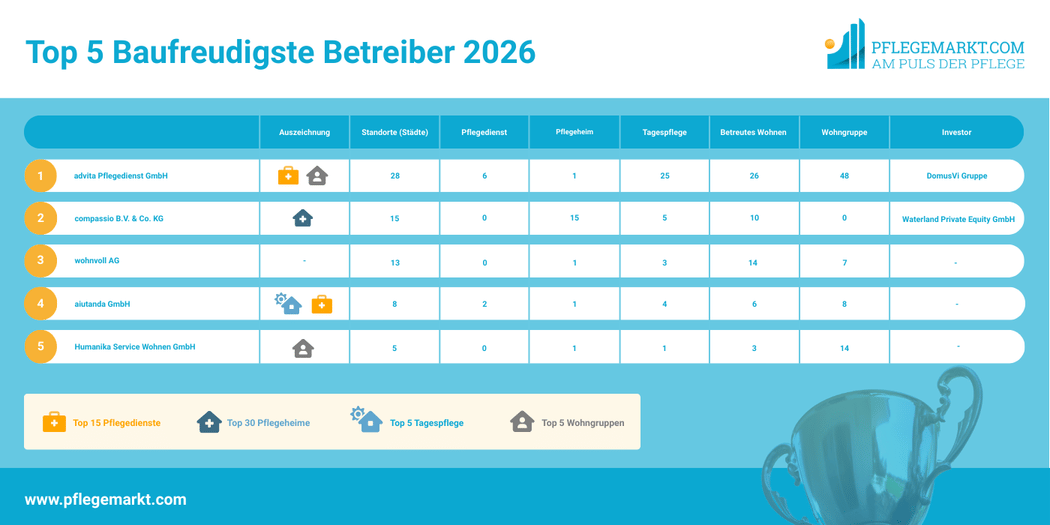 An der Spitze der Top 5 Betreiber mit den meisten im Bau befindlichen Angeboten findet sich erneut die advita Pflegedienst GmbH ein – an 28 Standorten entstehen 26 Betreute Wohnanlagen, 6 Pflegeheime, 25 Tagespflegeeinrichtungen und 48 Wohngruppen. Advita ist in diesem Jahr ebenfalls in weiteren Rankings zu finden. Unter anderem im Ranking der Top 15 Pflegedienste und der Top 5 Wohngruppenbetreiber.