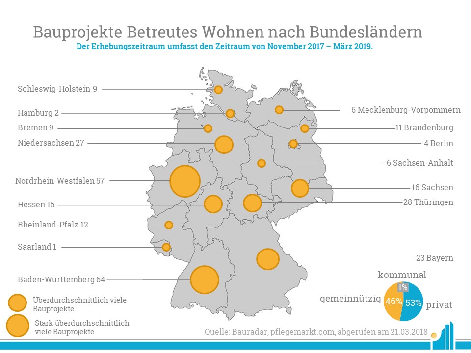 In der Rubrik Bauprojekte auf pflegemarkt.com erfahren Sie stets den aktuellen Stand der geplanten und im Bau befindlichen Pflegeeinrichtungen in Deutschland. Auch im neuen Monat konnten wir unseren Datensätzen weitere Pflegebauten hinzufügen. Insgesamt zählen wir aktuell 736 im Bau befindliche Pflegeangebote an 522 Pflegestandorten und konnten damit unseren Datensatz um 62 Pflegeangebote erhöhen (Vormonat: 47).
