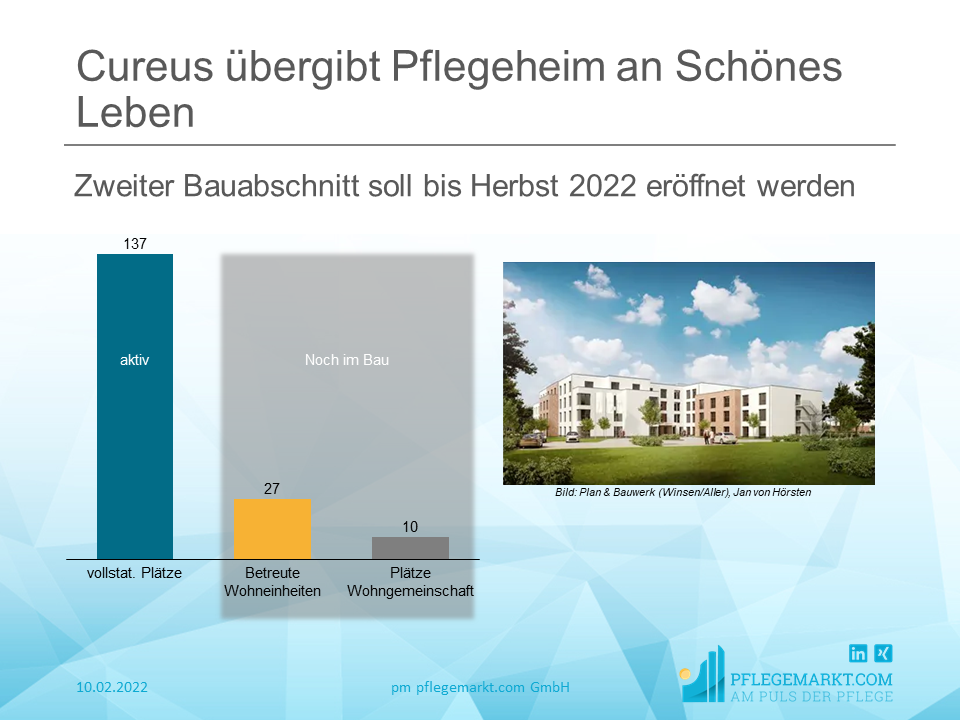 „Die neue Seniorenresidenz ist nach unserem modernen Standard der Systempflegeimmobilie mit hohem architektonischem Anspruch entstanden“, sagt Holger Johannesmann, Projektleiter für die Cureus. „Moderne und geräumige Pflegezimmer mit großzügigen Verglasungen und eine helle, freundliche Fassadengestaltung machen den Komplex zu einem Zuhause zum Wohlfühlen. Mit der SCHÖNES LEBEN Gruppe und ihrer Tochter MEDIKO haben wir erfahrene Experten für den Betrieb, die für eine individuelle Betreuung und Pflege in hoher Qualität einstehen.“