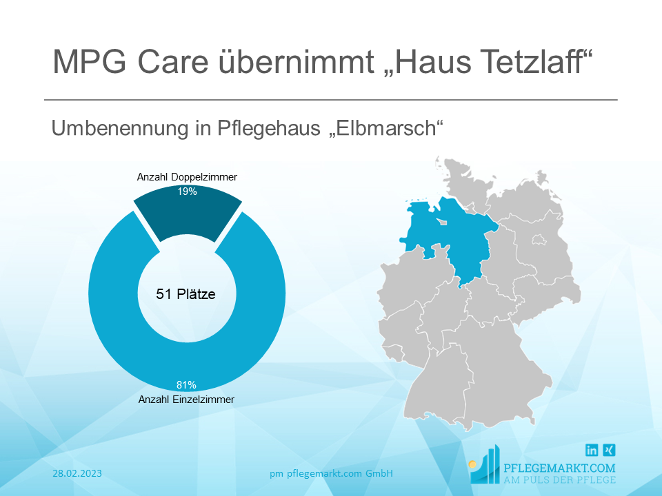 Wie der Dealradar von pflegemarkt.com aufzeigt, hat die MPG Care ein weiteres Pflegeheim für ihr Portfolio übernommen. Bereits zum November 2022 übernahm die MPG Care GmbH alle Anteile an der Seniorenpflege „Haus Tetzlaff“ GmbH mit Sitz in Bleckede.
