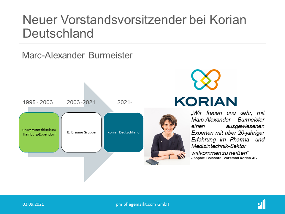 Zum 1. September 2021 wurde Marc-Alexander Burmeister zum Vorstandsvorsitzenden der Korian Deutschland AG (Rang 1 der Top 30 Pflegeheimbetreiber 2021) und Mitglied des Group Management Boards des Korian AG Konzerns berufen.