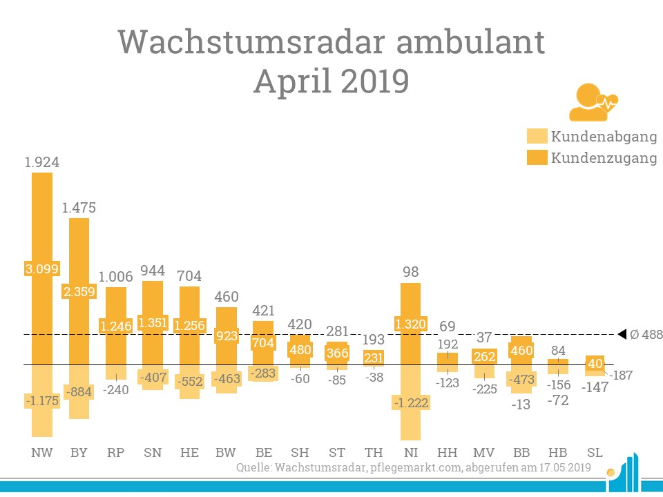 Im ambulanten Bereich gab es im April insgesamt 851 Veränderungseinträge in Bezug auf die versorgten Patienten. 533 Einrichtungen konnten einen Nettozugang an Kunden verzeichnen. Insgesamt konnten 19 Pflegedienste aufgelistet werden, die ein Wachstum von über 100 Patienten im Vergleich zum Vormonateszeitraum verzeichnen. Das Patientenwachstum muss zudem im Einklang mit der Mitarbeiterakquise stehen und stellt somit eine herausragende Leistung dar.